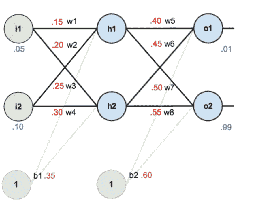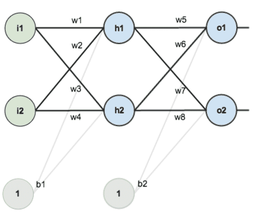 第一层是输入层,包含两个神经元i1,i2,和截距项b1;第二层是隐含层,包含两个神经元h1,h2和截距项b2,第三层是输出o1,o2,每条线上标的wi是层与层之间连接的权重,激活函数我们默认为sigmoid函数。