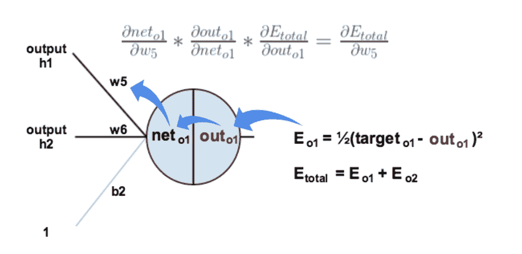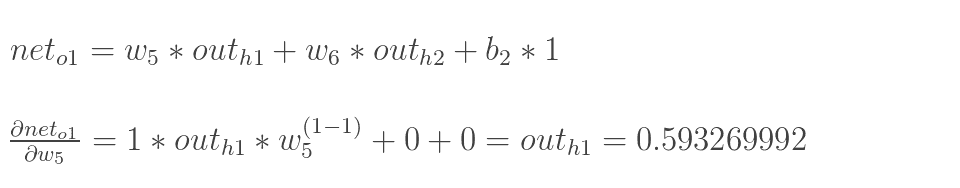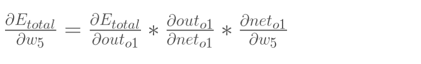 以权重参数w5为例,如果我们想知道w5对整体误差产生了多少影响,可以用整体误差对w5求偏导求出: (链式法则)