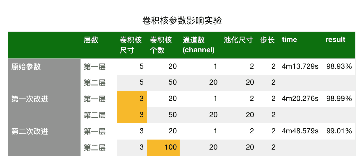 - 第二次改进: 保持3*3的卷积核大小,仅改变第二层的卷积核数目,其他保持不变,可以看到结果相较于原始参数提升了0.08%