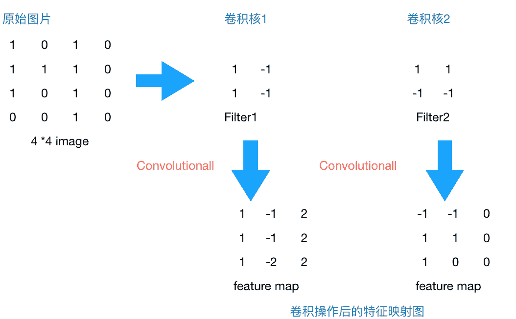 注: 1.此处的卷积运算是两个卷积核大小的矩阵的内积运算,不是矩阵乘法。即相同位置的数字相乘再相加求和。不要弄混淆了。