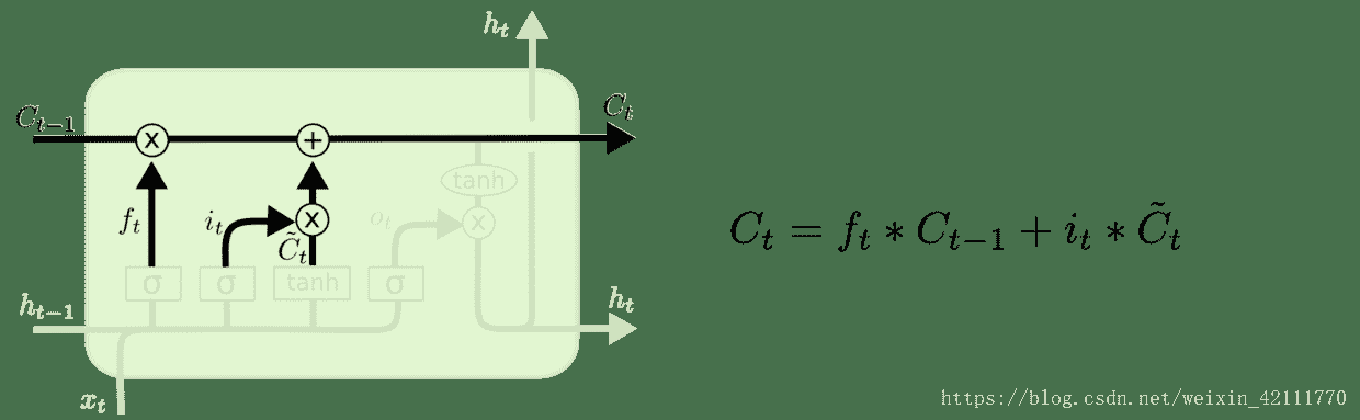 为输入门的两个输出乘法运算,表示有多少新信息被保留,基于此,我们就可以把新信息更新这一层的细胞状态