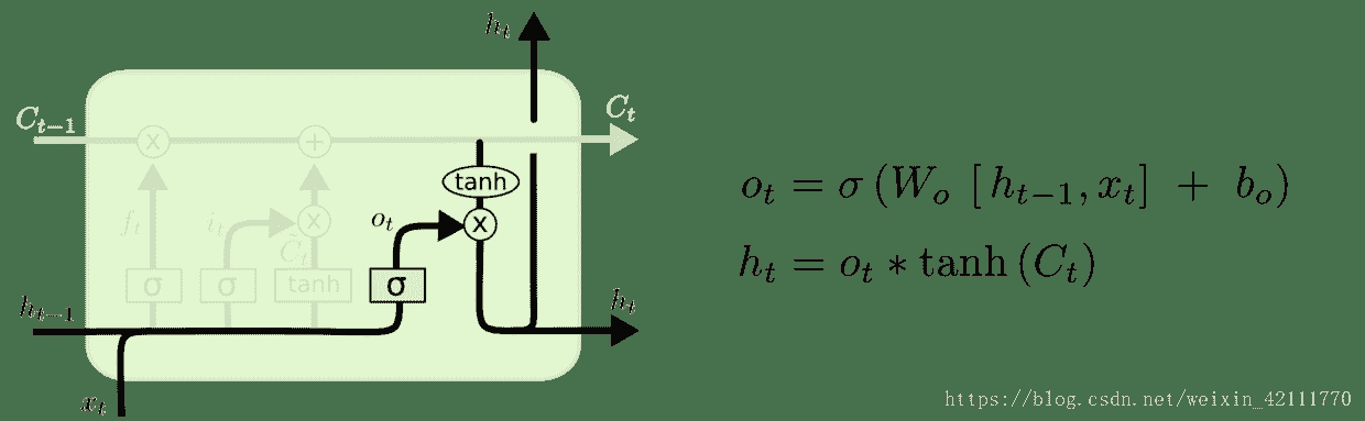 - 输出门: 输出门用来控制该层的细胞状态有多少被过滤。首先使用sigmoid激活函数得到一个[0,1]区间取值的