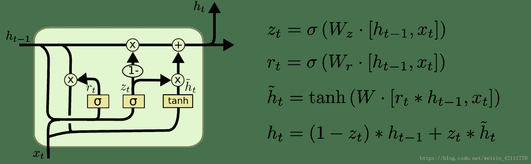 进行更新。更新门控制过去的隐含状态在当前时刻的重要性,如果更新门一直趋近于1,t时刻之前的隐含状态将一直保存下来并全传递到t时刻,更新门有助于捕捉时序数据中中长期的依赖关系。