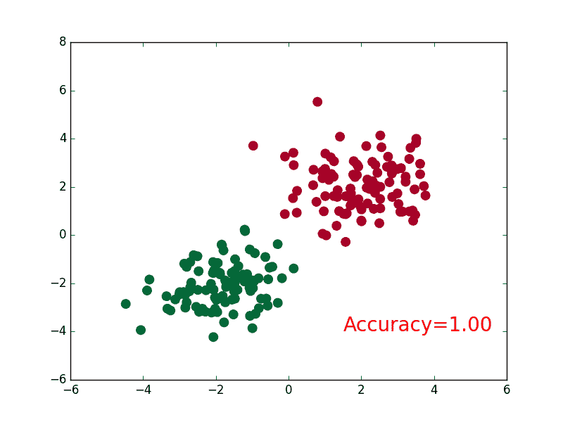 plt.text(1.5, -4, \'Accuracy=%.2f\' % accuracy, fontdict={\'size\': 20, \'color\': \'red\'})