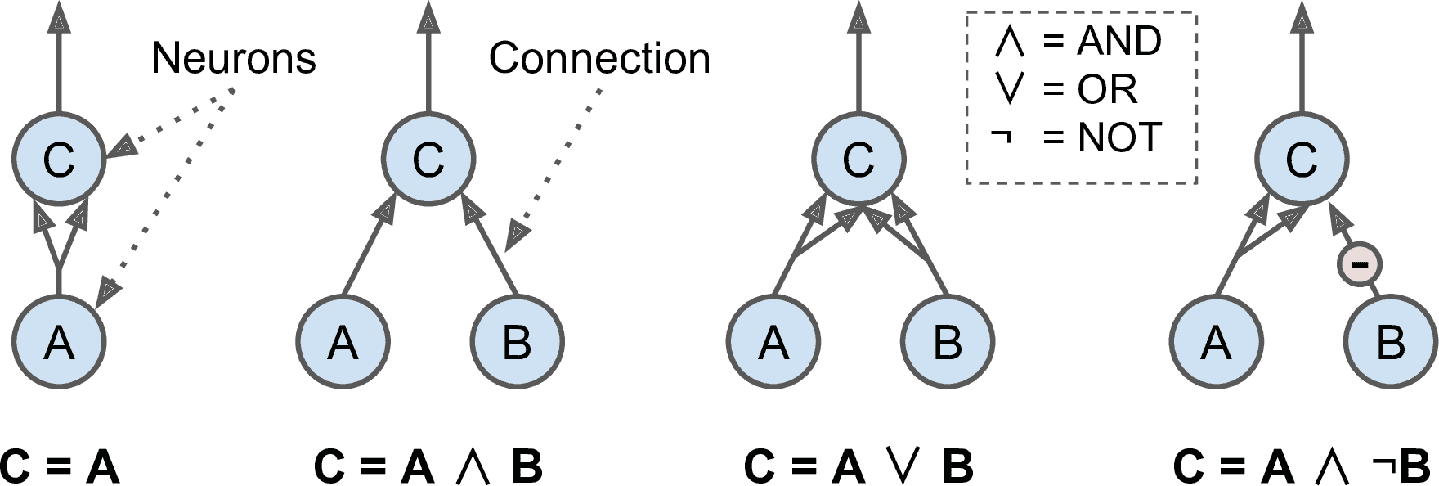B关闭,只有当神经元A是激活的,神经元C才被激活。如果神经元A始终是激活的,那么你得到一个逻辑 NOT:神经元C在神经元B关闭时是激活的,反之亦然。