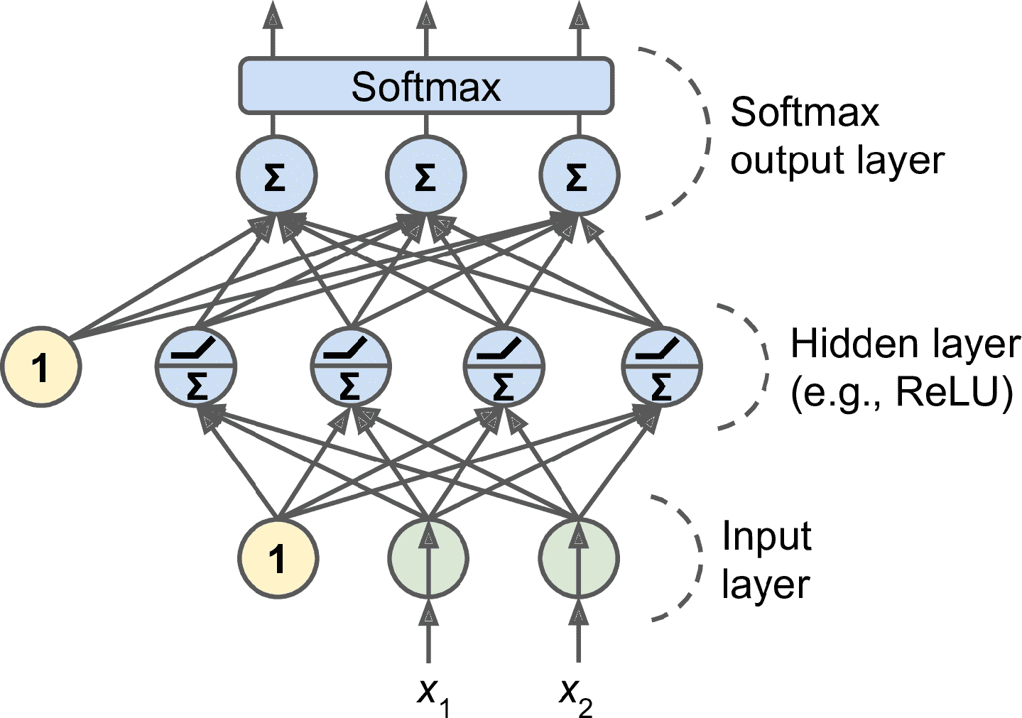 图 10-5 一个具有两个输入神经元、一个偏置神经元和三个输出神经元的感知机架构