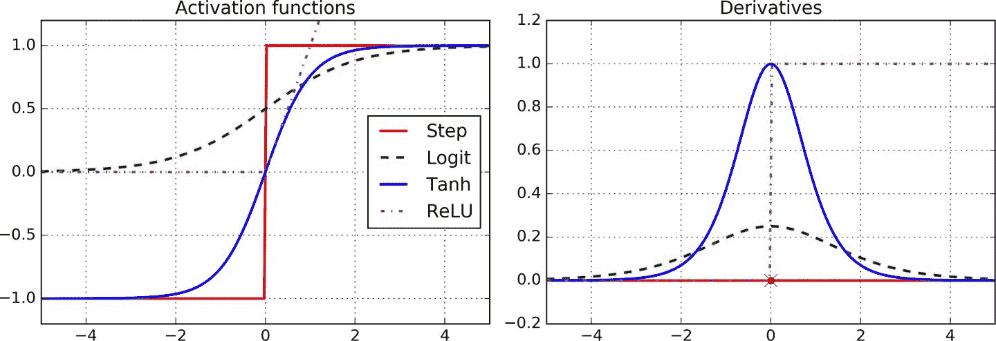 为了使 BP 算法正常工作,作者对 MLP 的架构做了一个关键调整:用 Logistic 函数(sigmoid)代替阶跃函数,σ(z) = 1 / (1 + exp(–z))。这是必要的,因为阶跃函数只包含平坦的段,因此没有梯度(梯度下降不能在平面上移动),而 Logistic 函数处处都有一个定义良好的非零导数,允许梯度下降在每步上取得一些进展。反向传播算法也可以与其他激活函数一起使用,下面就是两个流行的激活函数:
