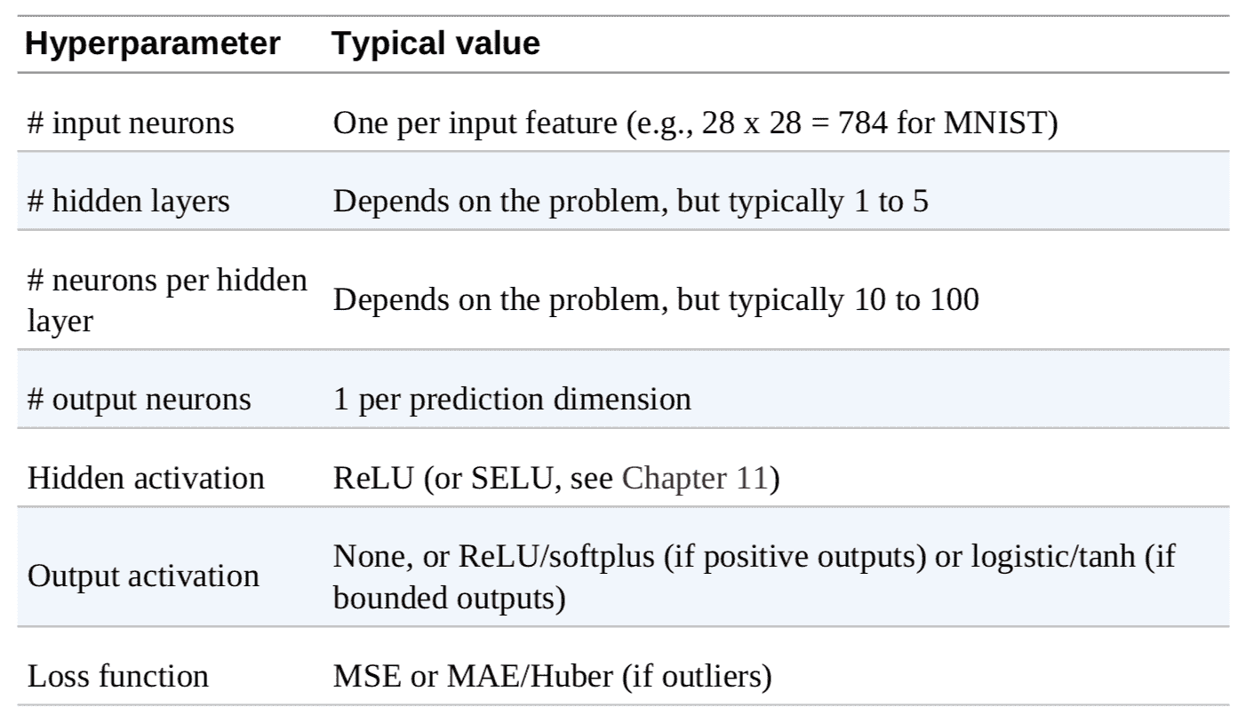 尽管有这些工具和服务,知道每个超参数该取什么值仍然是帮助的,可以快速创建原型和收缩搜索范围。后面的文字介绍了选择 MLP 隐藏层数和神经元数的原则,以及如何选择主要的超参数值。