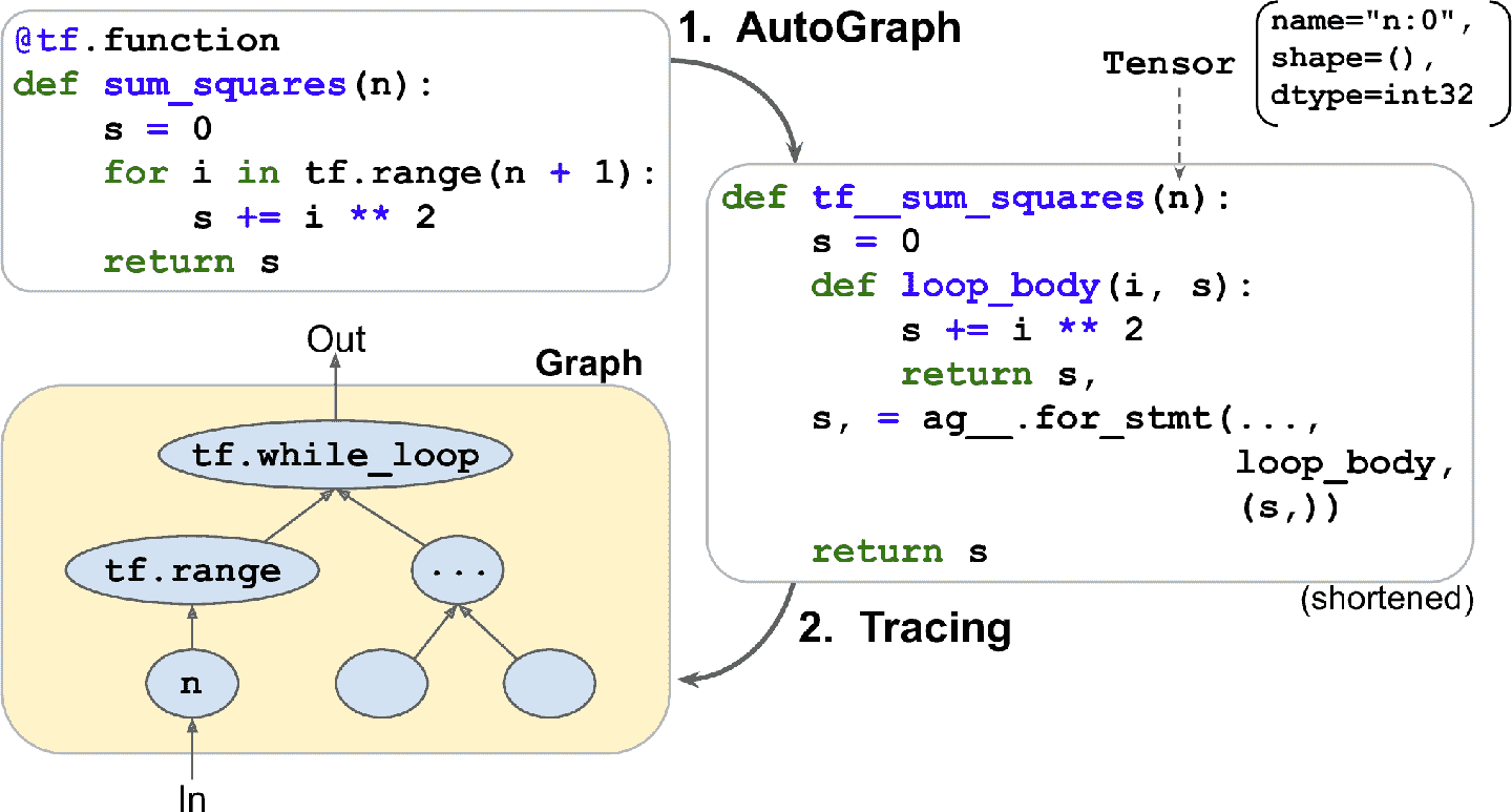 TensorFlow 使用了即时 JIT 编译器对计算速度和内存使用优化。编译器的工作是从 Python 函数提取出计算图,然后对计算图优化(比如剪切无用的节点),最后高效运行(比如自动并行运行独立任务);