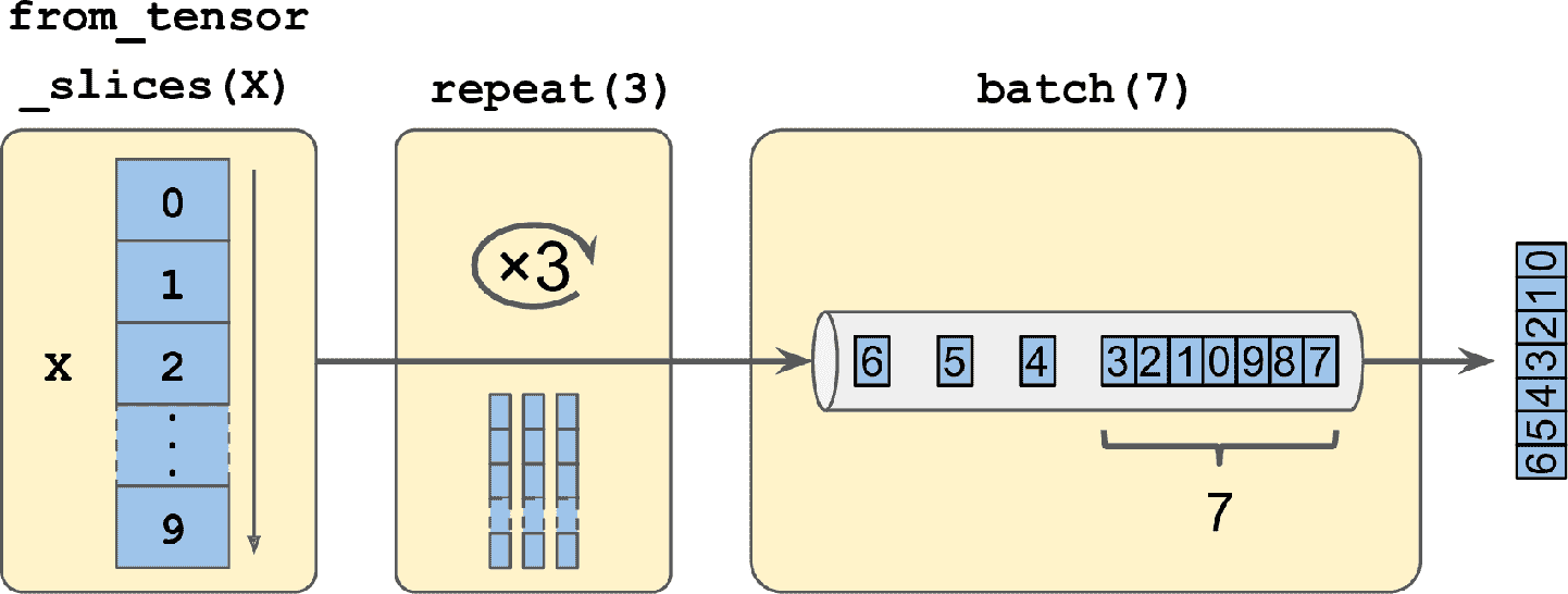 函数from_tensor_slices()取出一个张量,创建了一个tf.data.Dataset,它的元素是X的全部切片,因此这个数据集包括 10 项:张量 0、1、2、...、9。在这个例子中,使用tf.data.Dataset.range(10)也能达到同样的效果。