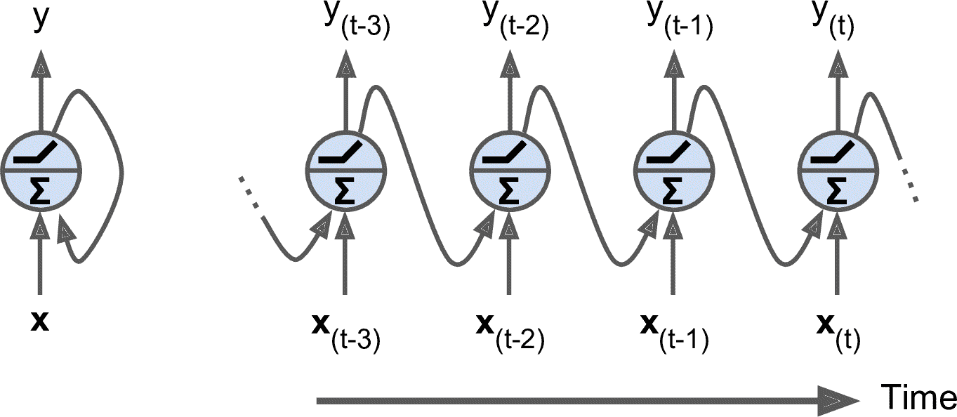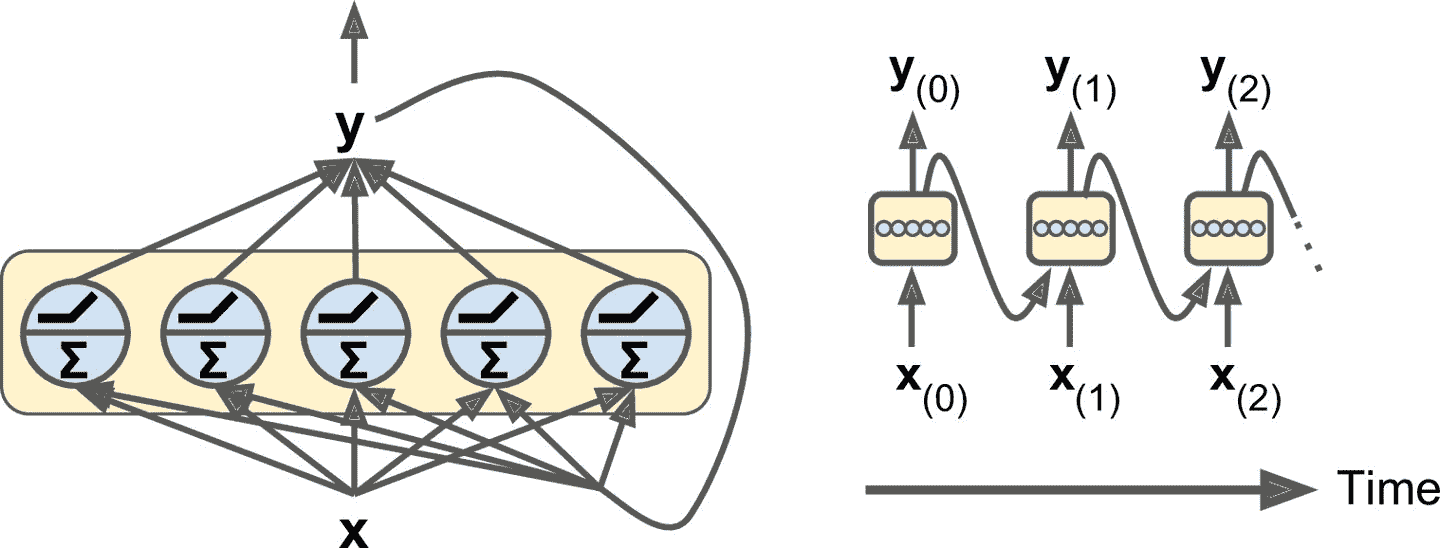 图 15-2 一层循环神经元(左),及其随时间展开(右)