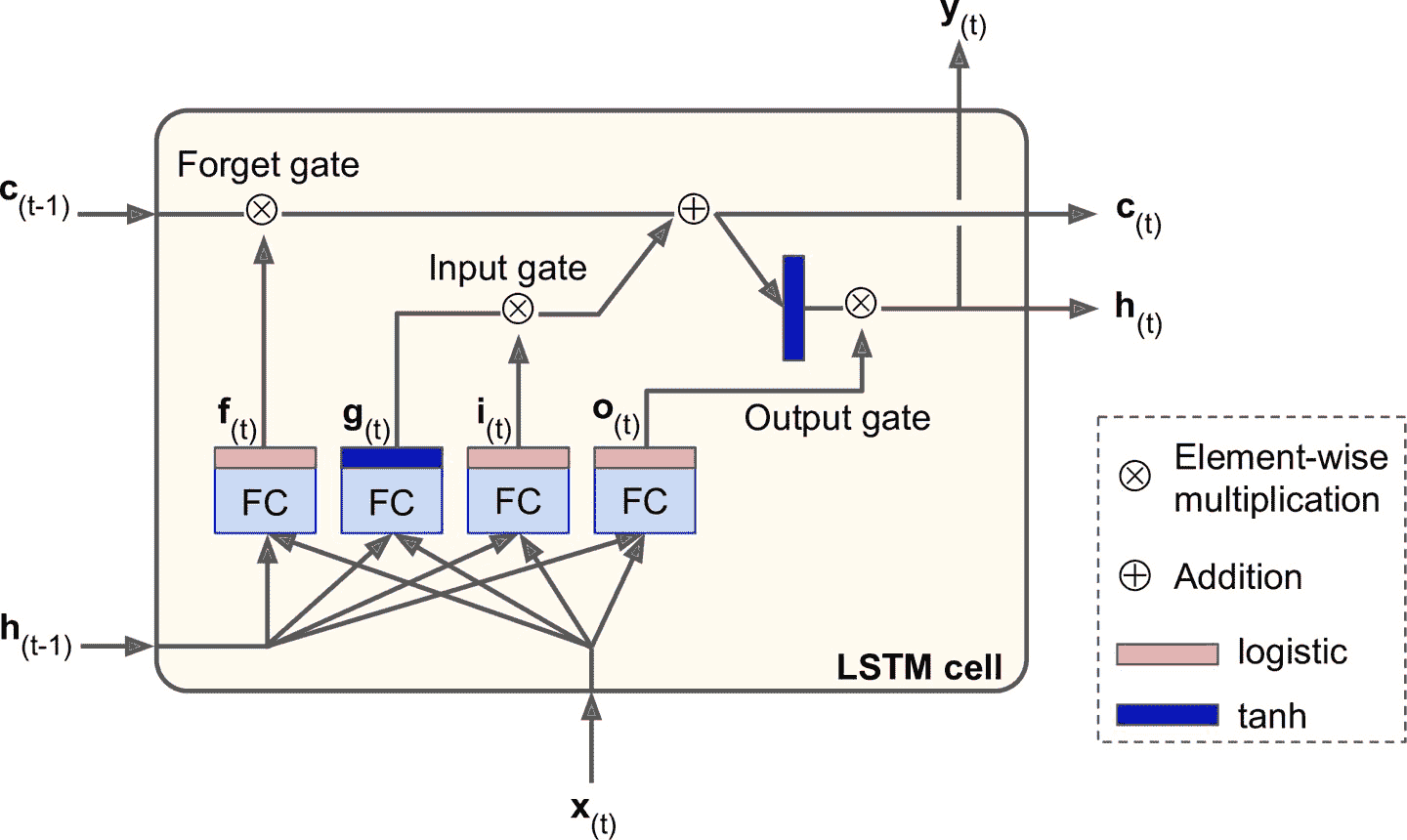 LSTM 单元的工作机制是什么呢?图 15-9 展示了 LSTM 单元的结构。