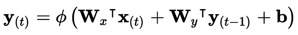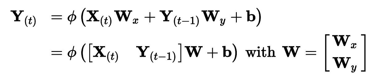 W[x]和W[y]通常纵向连接成一个权重矩阵W,形状为(n_inputs + n_neurons) × n_neurons(见公式 15-2 的第二行)