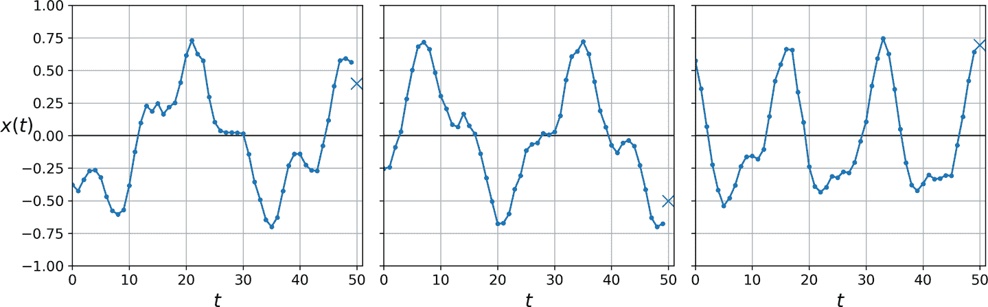 假设你在研究网站每小时的活跃用户数,或是所在城市的每日气温,或公司的财务状况,用多种指标做季度衡量。在这些任务中,数据都是一个序列,每步有一个或多个值。这被称为时间序列。在前两个任务中,每个时间步只有一个值,它们是单变量时间序列。在财务状况的任务中,每个时间步有多个值(利润、欠账,等等),所以是多变量时间序列。典型的任务是预测未来值,称为“预测”。另一个任务是填空:预测(或“后测”)过去的缺失值,这被称为“填充”。例如,图 15-6 展示了 3 个单变量时间序列,每个都有 50 个时间步,目标是预测下一个时间步的值(用X表示)。