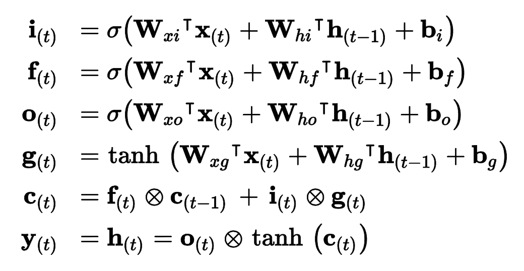 公式 15-3 总结了如何计算单元的长时状态,短时状态,和单个实例的在每个时间步的输出(小批次的公式和这个公式很像)。