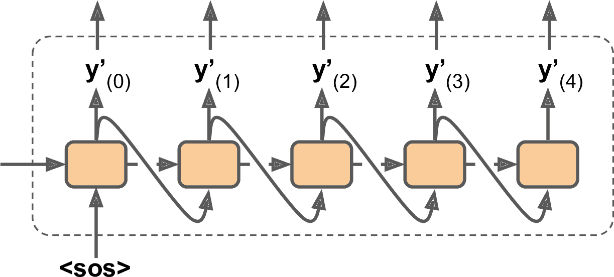 在推断时,解码器不能接收目标,所以输入的是前面的输出词(起点用 SOS 标记)。因此模型需要重复被调用,每一轮预测一个词(预测出来的词在下一轮输入给解码器,直到输出 EOS 标记)。