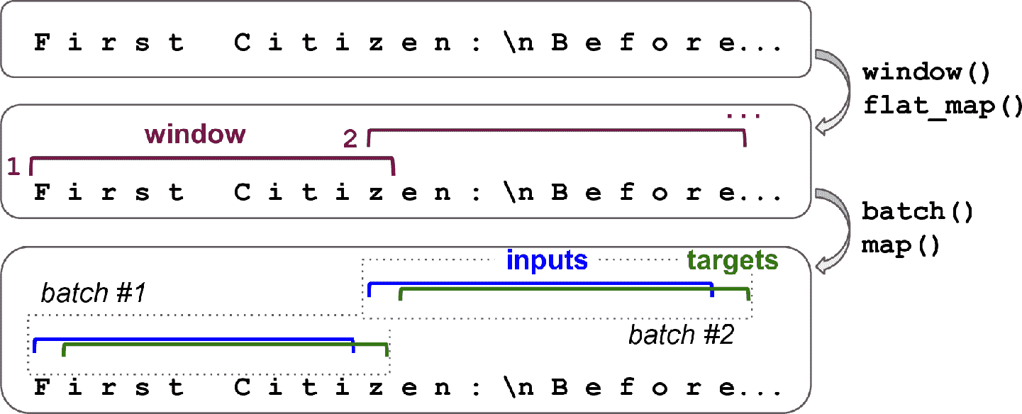 默认情况下,window()方法创建的窗口是不重叠的,但为了获得可能的最大训练集,我们设定shift=1,好让第一个窗口包含字符 0 到 100,第二个窗口包含字符 1 到 101,等等。为了确保所有窗口是准确的 101 个字符长度(为了不做填充而创建批次),设置drop_remainder=True(否则,最后的 100 个窗口会包含 100 个字符、99 个字符,一直到 1 个字符)。