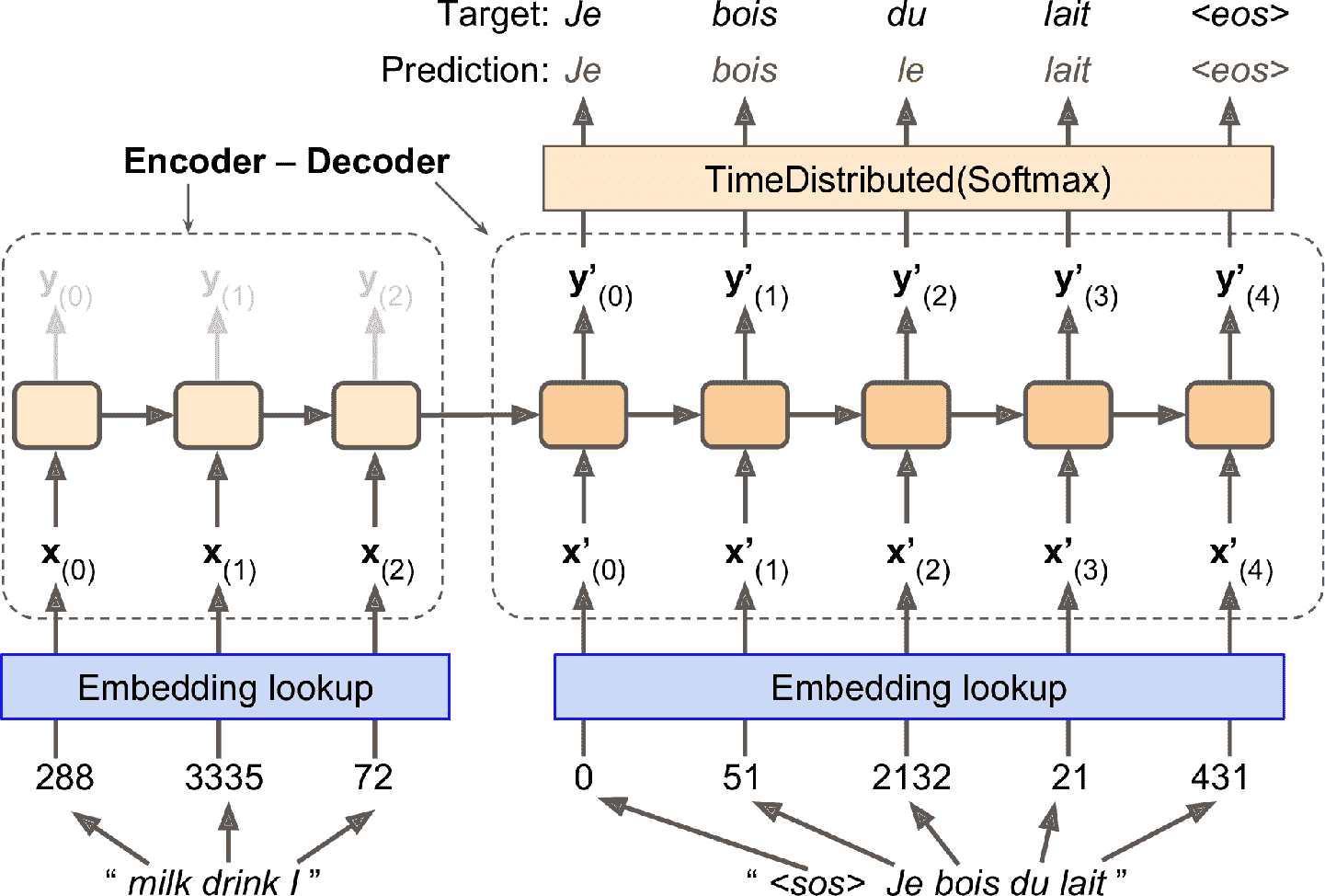 架构的右边是解码器。在训练中,它接收目标句子作为输入(也是表征为序列化的单词 ID),向右偏移一个时间步(即,在起点插入一个 SOS 标记)。它还接收编码器的输出(即,来自左边的箭头)。注意,解码器的头部也重叠了