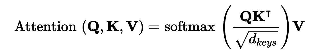 Q K^T的形状是[n_queries, n_keys]:它包含这每个查询/键对的相似分数。softmax 函数的输出有相同的形状,且所有行的和是 1。最终的输出形状是[n_queries, d_values],每行代表一个查询结果(值的加权和)。 -